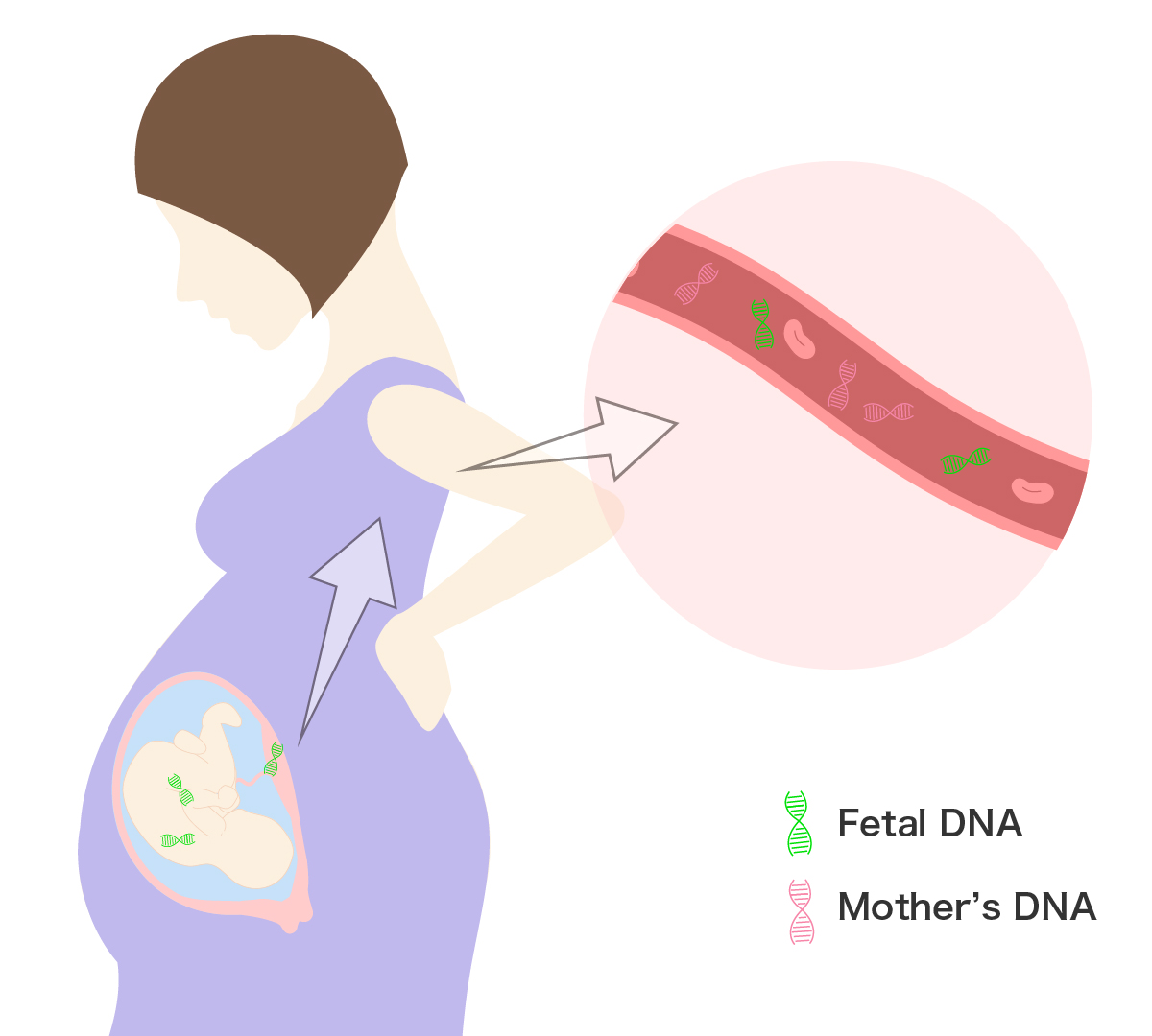 Fetal DNA is contained in the mother's blood. It begins to flow through the placenta into the mother's bloodstream from the 6th week of pregnancy. After that, the amount of fetal DNA in the maternal blood increases in proportion to the gestation period, and it reaches a high level after the 14th week of gestation. Fetal DNA can be analyzed by extracting DNA from maternal blood and distinguishing it from maternal DNA.